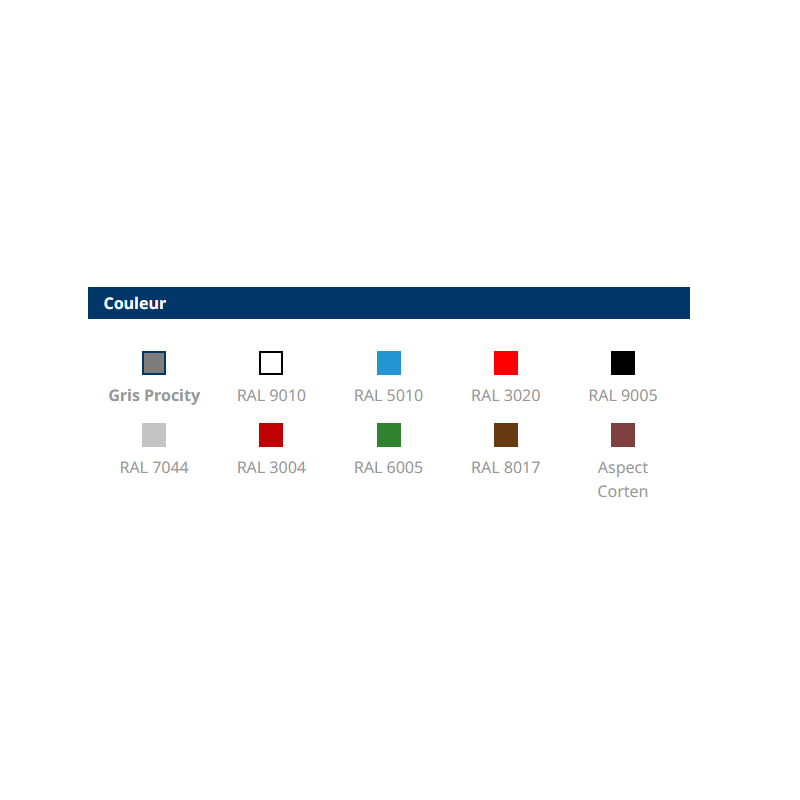 Structure en acier : 450 x 450 mm, ép. 3 mm peint sur zinc selon nos coloris.