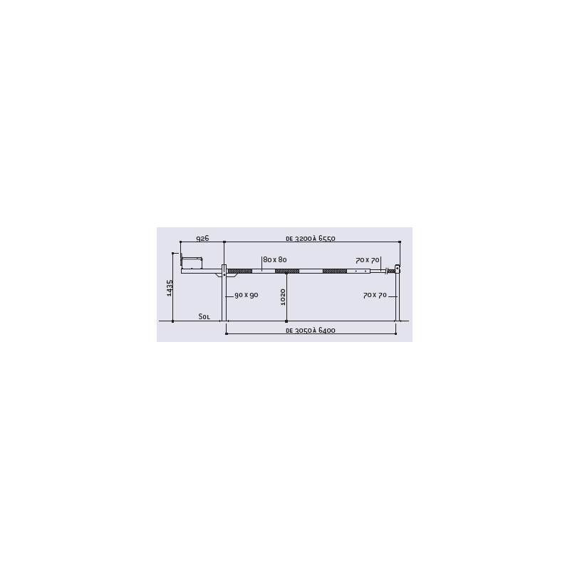 Largeur : modulable de 3200 à 6550 mm (distance entre l’axe de rotation et l’extrémité de la barrière) pour une largeur entre poteaux de 3050 à 6400 mm