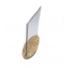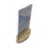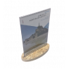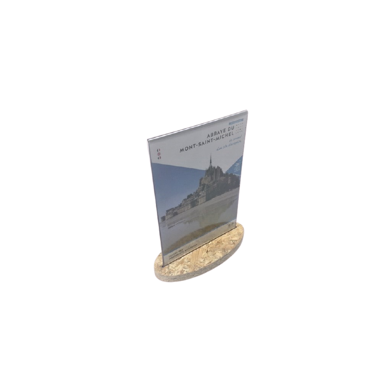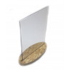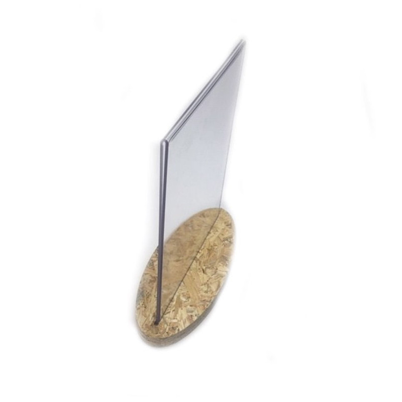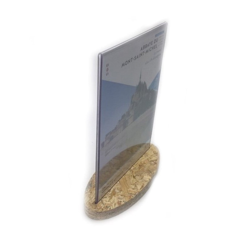 Support affiche ou menu réalisé en PET 2mm transparent (recyclable). Socle réalisé en copeaux de bois compressés OSB d'une épaisseur de 18mm. Orientation: Verticale.