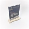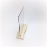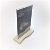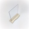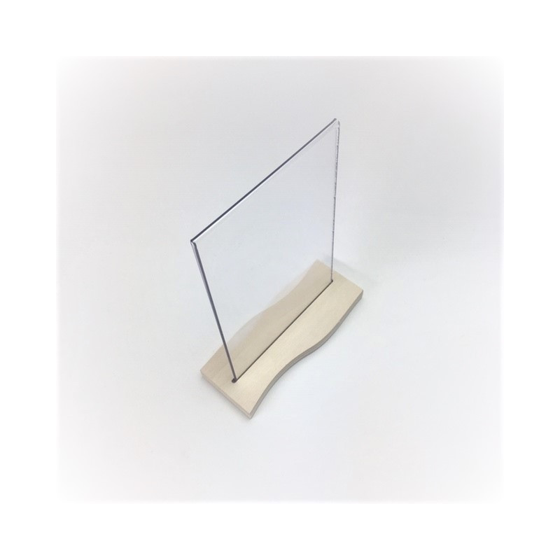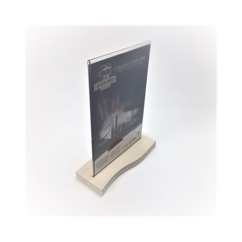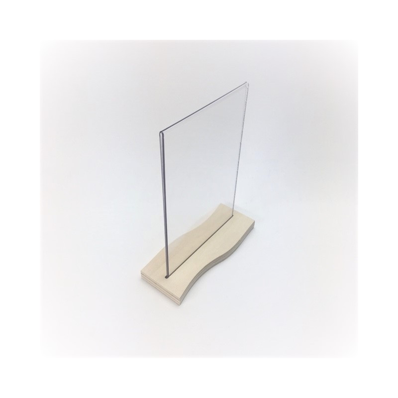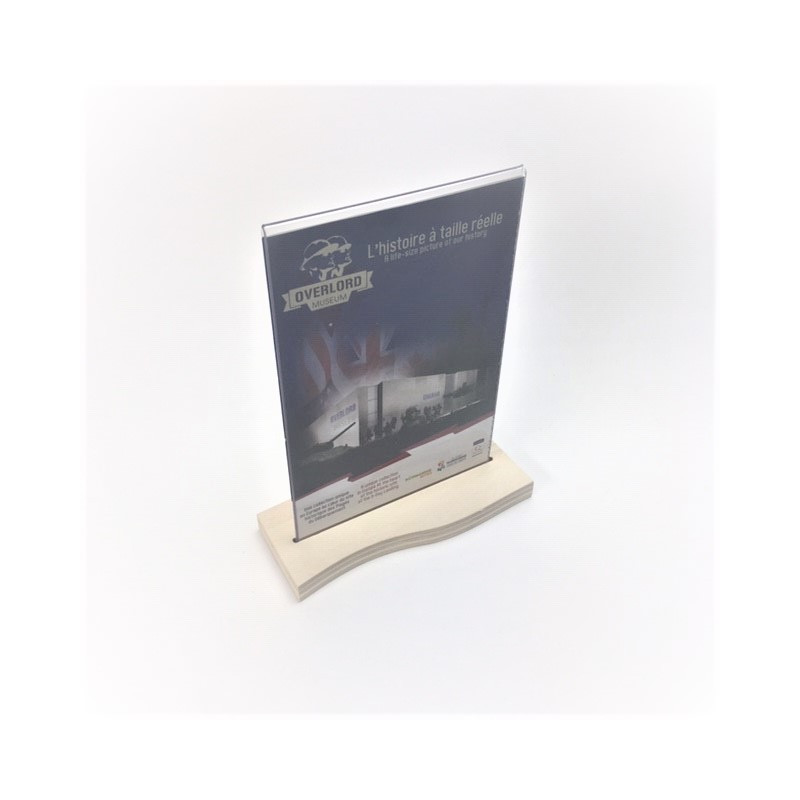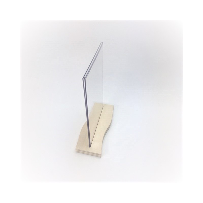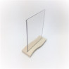 Support affiche ou menu réalisé en PET 2mm transparent (recyclable). Socle en forme de vague réalisé en bois cp aspect peuplier, épaisseur 15mm.