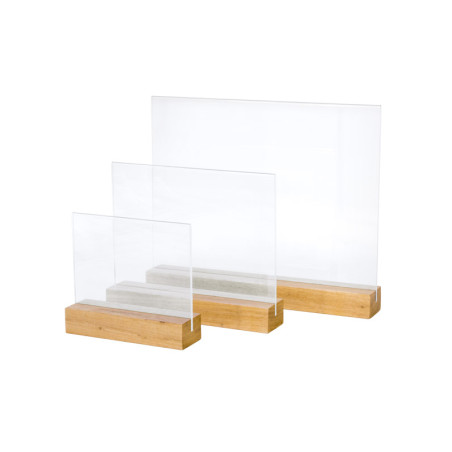 Porte affiche à poser sur table grâce à son pied en bois. Ce porte menu est à double face, idéal pour les tables de restaurants.