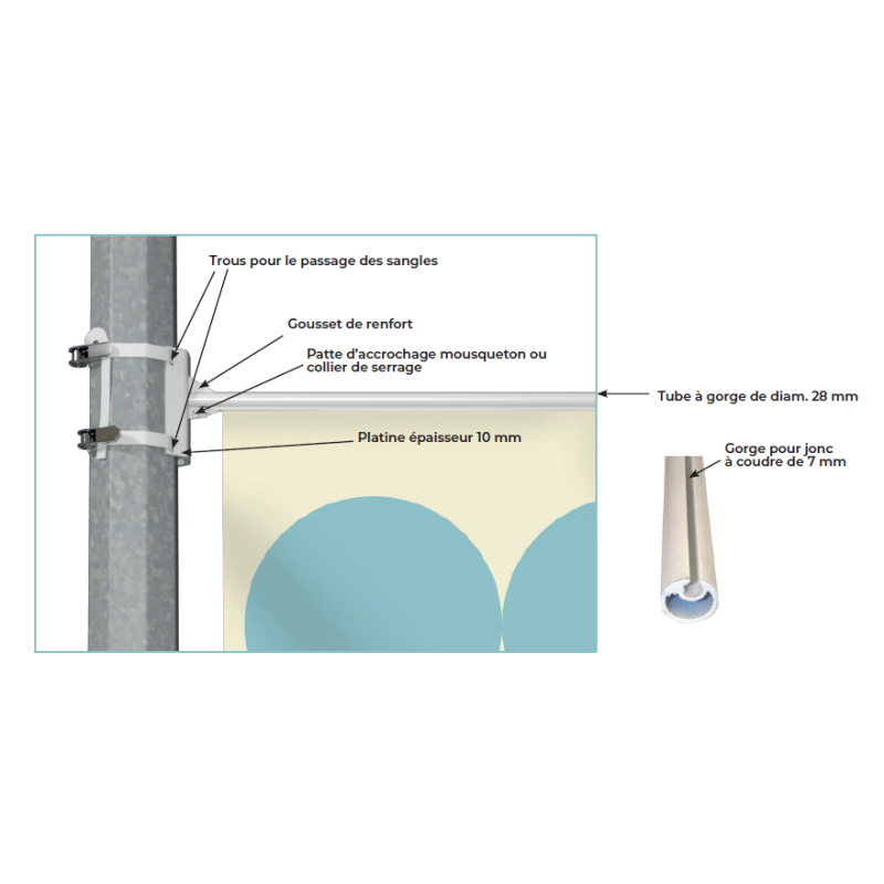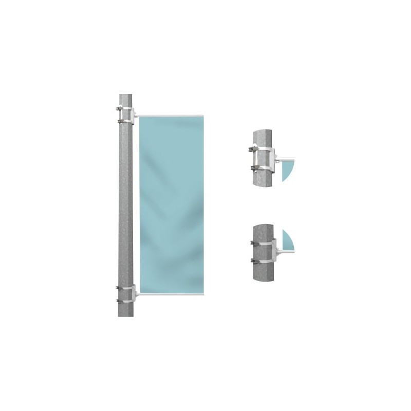 Ce kit est composé de 2 potences de 85 cm qui se fixent au poteau à l'aide de 2 sangles avec cliquet. Le kakémono se fixe soit à l'aide d'un jonc qui coulisse dans la potence, soit à l'aide d'un fourreau, et est maintenu en partie basse par un mousqueton ou un œillet.