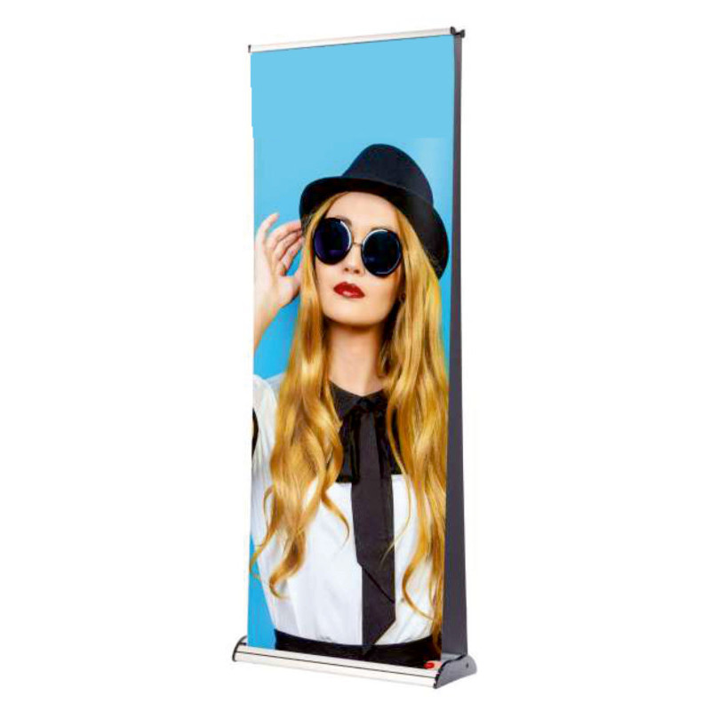 Ce roll up à double face est particulièrement adapté aux centres commerciaux, aux aéroports, et autres endroits à fort passage multidirectionnel. Avec sa finition en aluminium, son pied dépliable pour une stabilité accrue, et son mât à élastique robuste.
