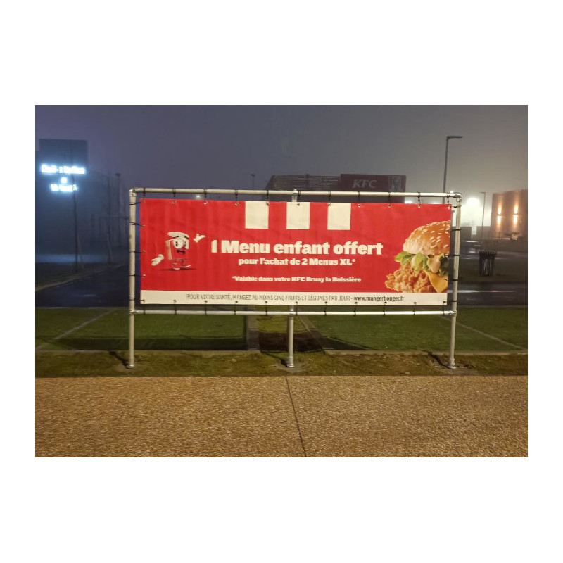 Réalisation de calicot publicitaire avec son cadre fixé au sol, il permet une installation sur terre-plein et un changement de banderole facilité en fonction de vos actions commerciales