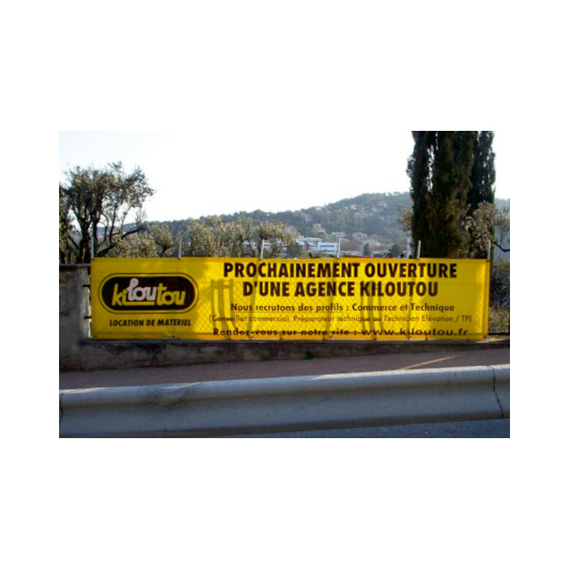 Réalisation d'un grande banderole publicitaire d'information de l'ouverture d'une agence fixation avec œillets en bord de route.