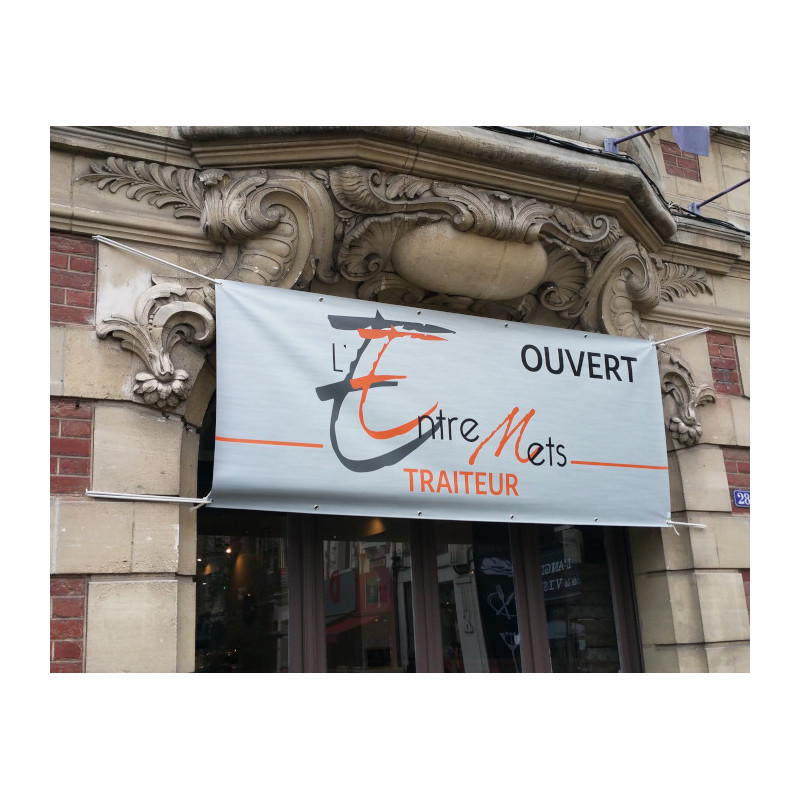 Réalisation d'un calicot sur façade fixation par tension idéal pour annoncer l'ouverture d'un site
