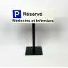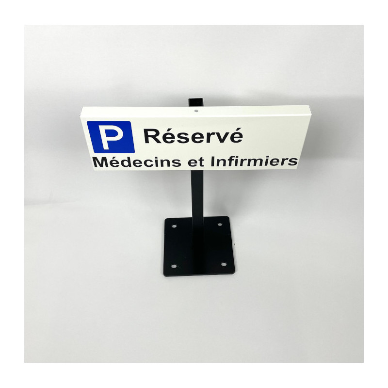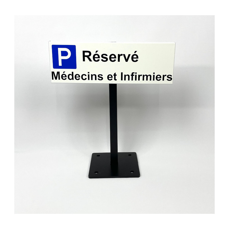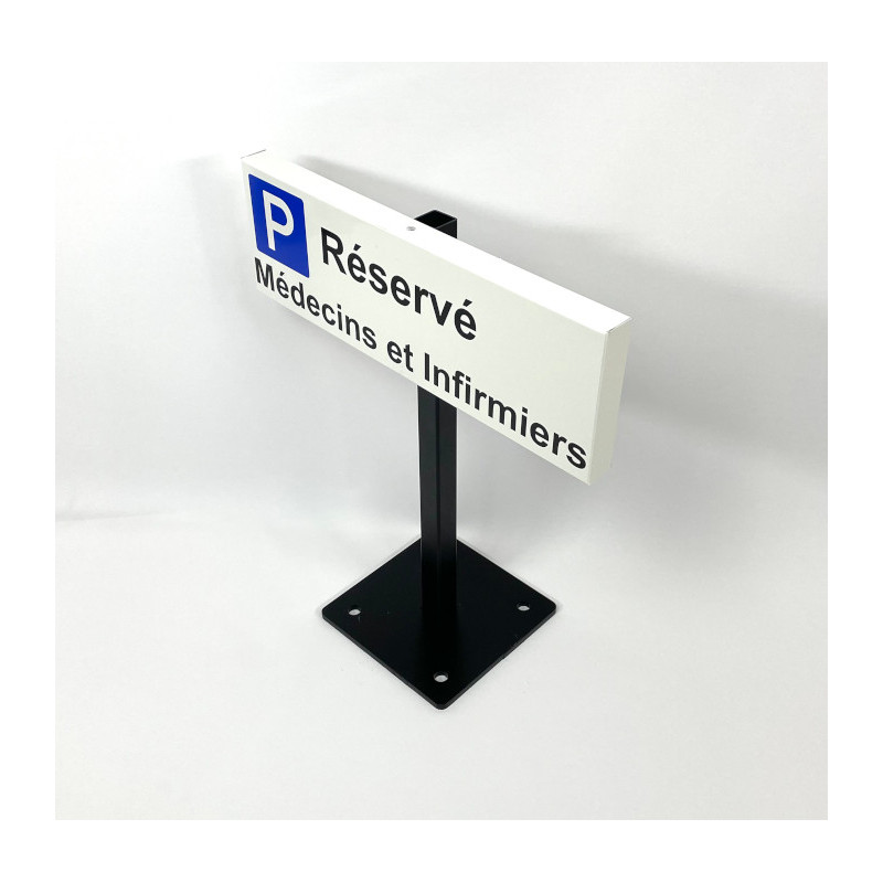 Réalisation d'un petit panneau pour place de parking réservé fixation individuelle par place avec support composé d'un mat et d'un platine à fixer au sol.