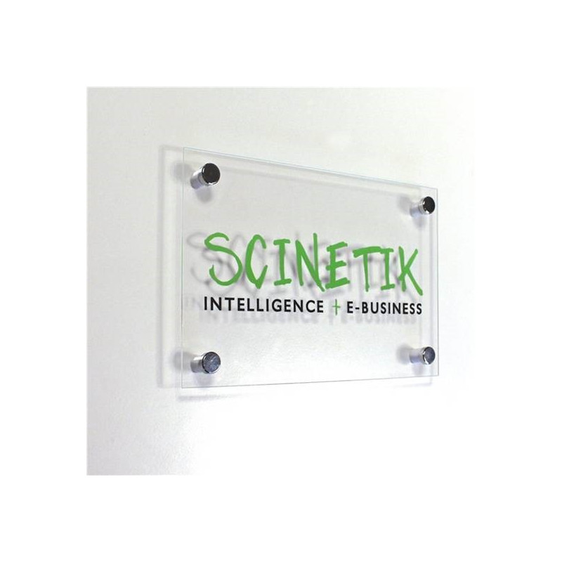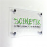 Réalisation d'une signalétique professionnelle murale en plexiglas avec lettrage adhésive en vitrophanie et fixation 4 entretoise design