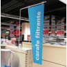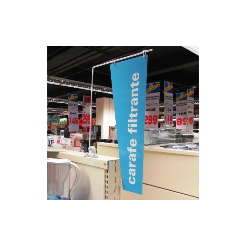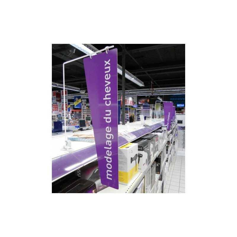 Réalisation de panneau de PLV séparateur vertical pour rayon magasin. Cette signalétique magasin permet une visualisation des familles de produits le long des linéaires. Réalisé avec une potence PLV en L métallique avec fixation magnétique et panneau suspendu en PVC imprimé