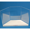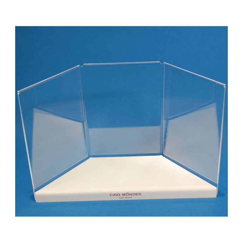 Petit podium en PVC blanc avec un pliage transparent 3 faces pour glisser vos visuels derrière le produit présenté