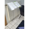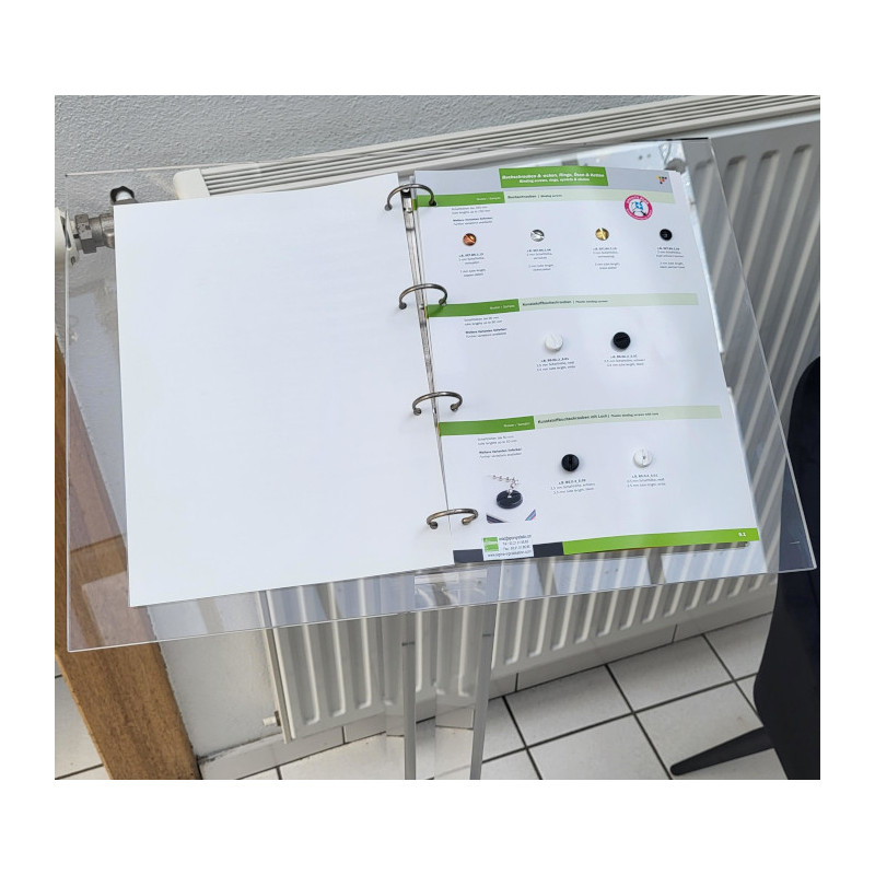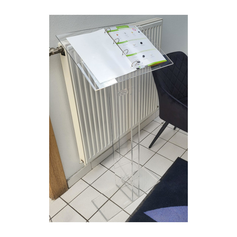 Réalisation d'un pupitre en plexiglas transparent à poser au sol avec quatre anneaux type classeur, idéal pour présenter des documents ou brochures à consulter sur place