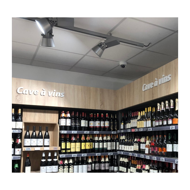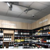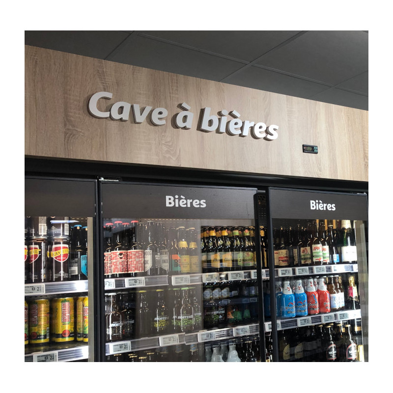 Réalisation de lettres relief en PVC blanc fixé sur bandeau haut de rayon pour signalisé les différent secteur de la cave à bière et de la cave à vin