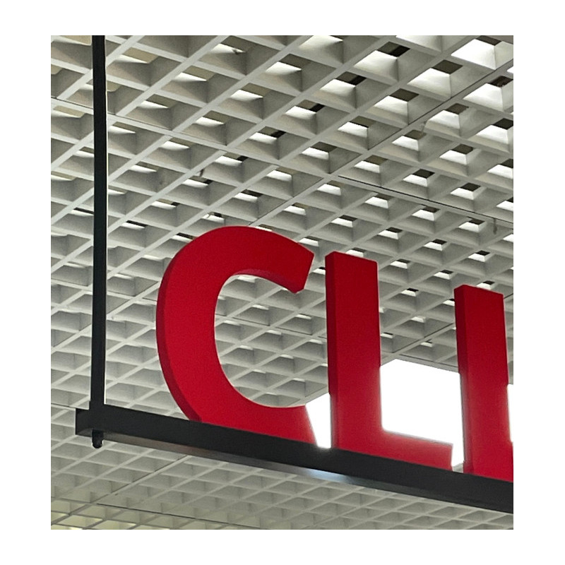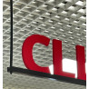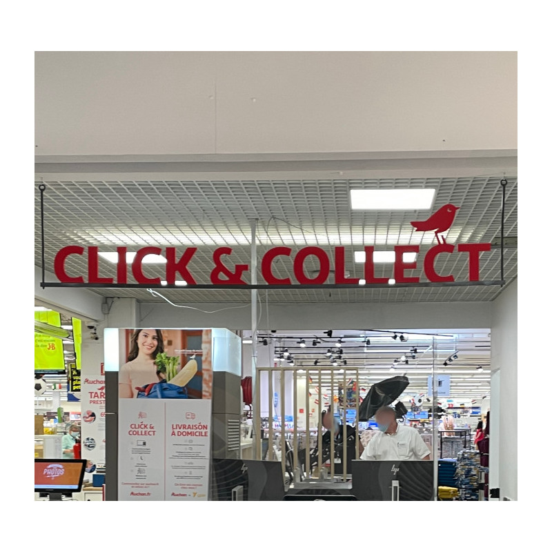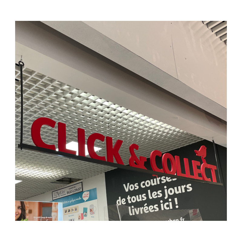 Réalisation de lettres pour enseigne en relief fixé sur un rail horizontal ensemble suspendu avec une tige au plafond