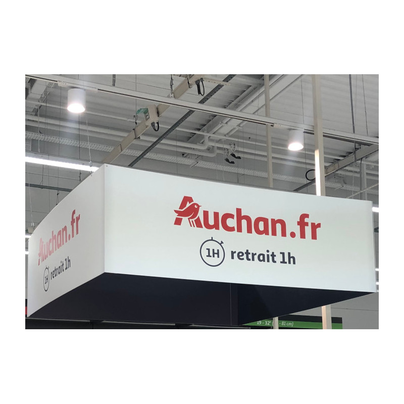 Ce caisson de signalétique suspendu est réaliser en aludibond quatre faces pour une visibilité maximum par les clients