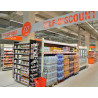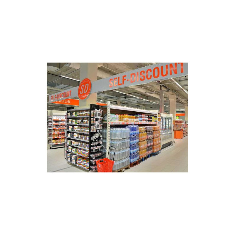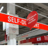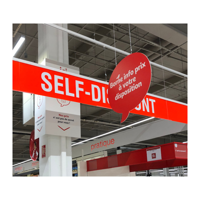 Réalisation de panneaux bandeaux suspendus pour délimitation de zones au sein d'un hypermarché. Ces panneaux de signalétiques suspendus sont fixés sur une structure tubulaire pour une bonne rigidité de l'ensemble au vu de la longueur des bandeaux