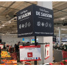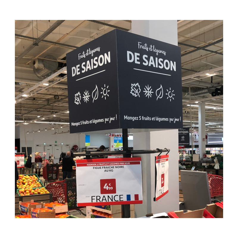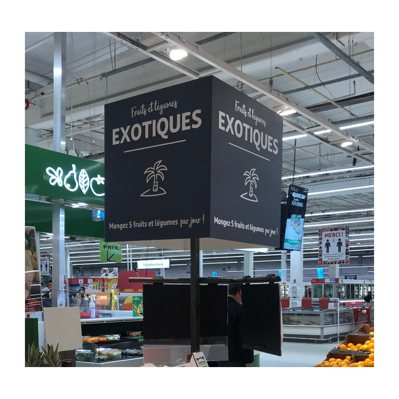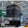 Ce caisson de PLV magasin est réaliser en alu dibond sur potence métallique avec un deuxième niveau d'information pour la fixation de PLV interchangeables