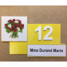 Réalisation de plaque de signalétique de porte avec trois niveaux d'informations. Un porte-étiquette pour visuel et un autre pour le nom permettant de changer les informations sur la signalétique de porte. Réalisation d'un numéro de porte en lettrage relief