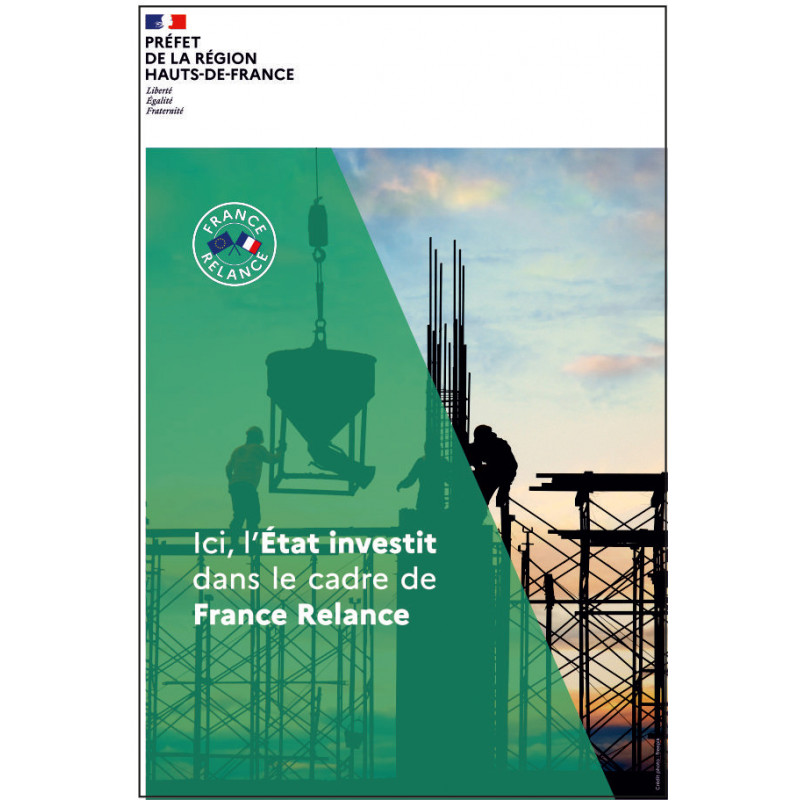 Affichage "Béton" , ce Panneau de signalisation - L’État investit de FRANCE RELANCE - vous permet d'afficher une communication des travaux en conformité avec le gouvernement Français lorsqu'il finance des travaux publics.