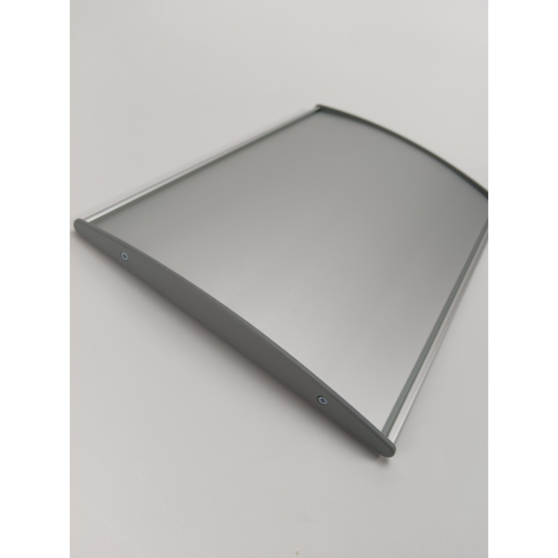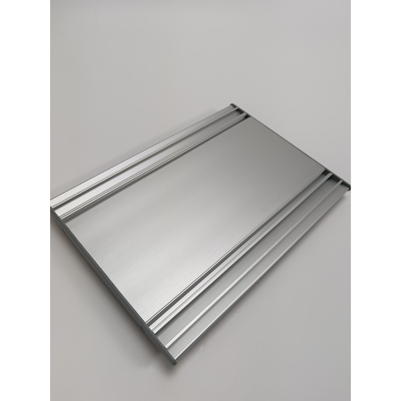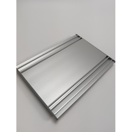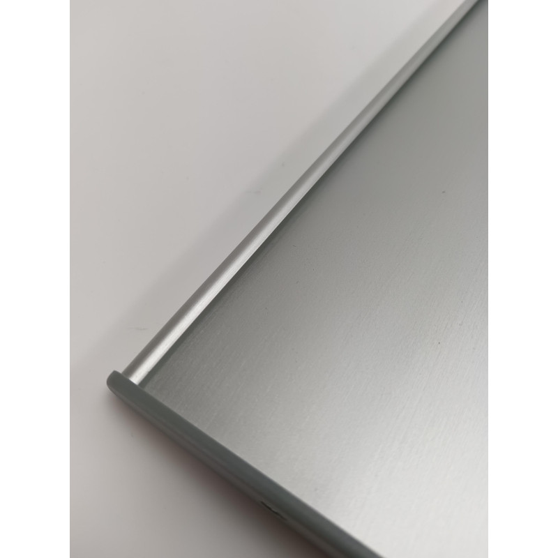 Cette plaque de porte est composée d'un cadre en aluminium incurvé, de 2 embouts plastiques et d'un film de protection en PVC.