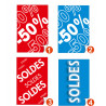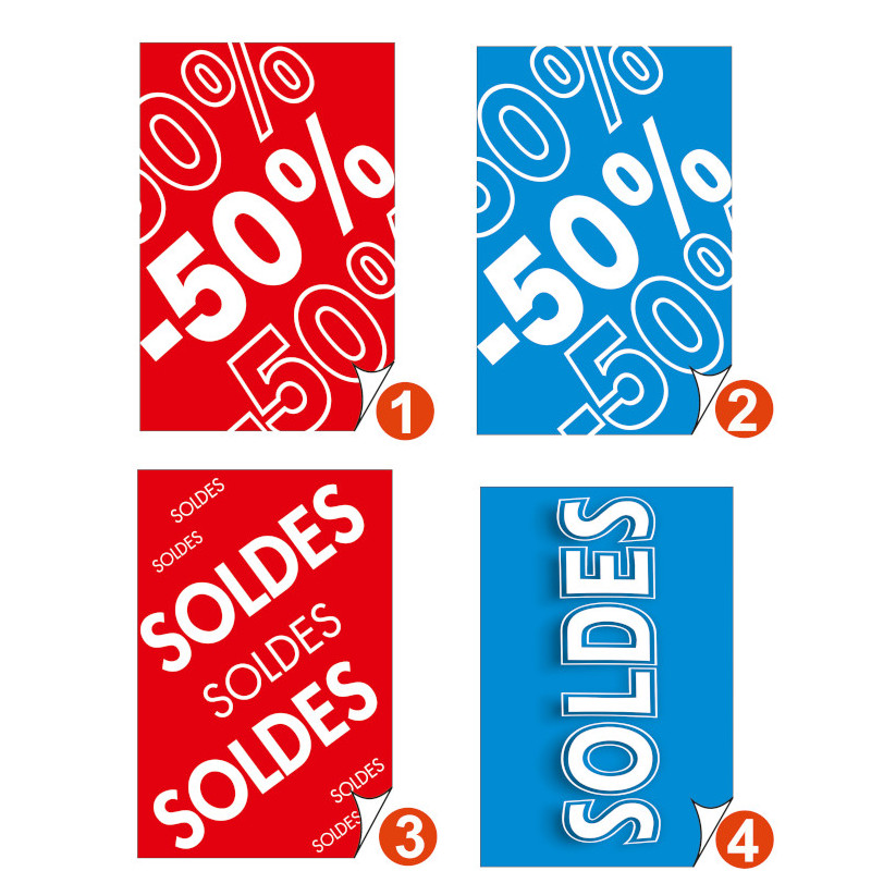Affiche de vitrine imprimée à coller pour les soldes (collage à prévoir par vos soins). Vous pouvez utiliser du simple scotch pour fixer votre affiche imprimée, ou bien de la patafix. Cette affiche pour vitrine de magasin est imprimée sur du papier dos bleu 210gr.