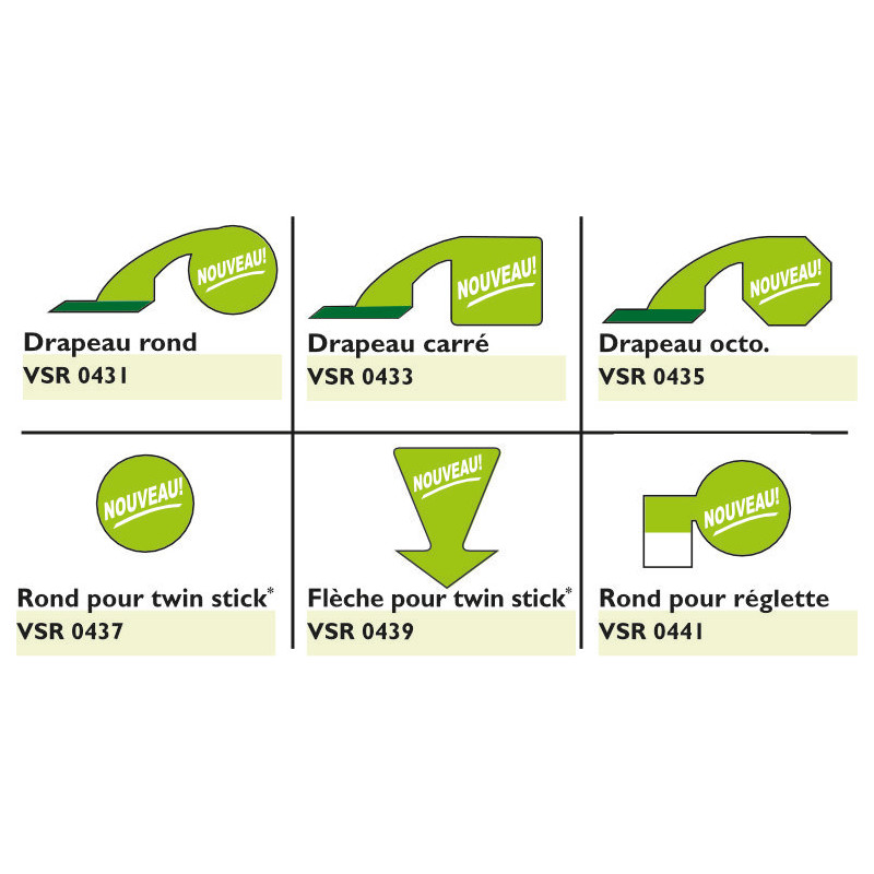 Disponible soit en drapeau Recto / Verso en PVC 0,5 + impression avec semelle magnétique (drapeaux), soit en version 1 face à fixer avec Twin stick (rond ou flèche pour Twinstick) soit à glisser dans la réglette.