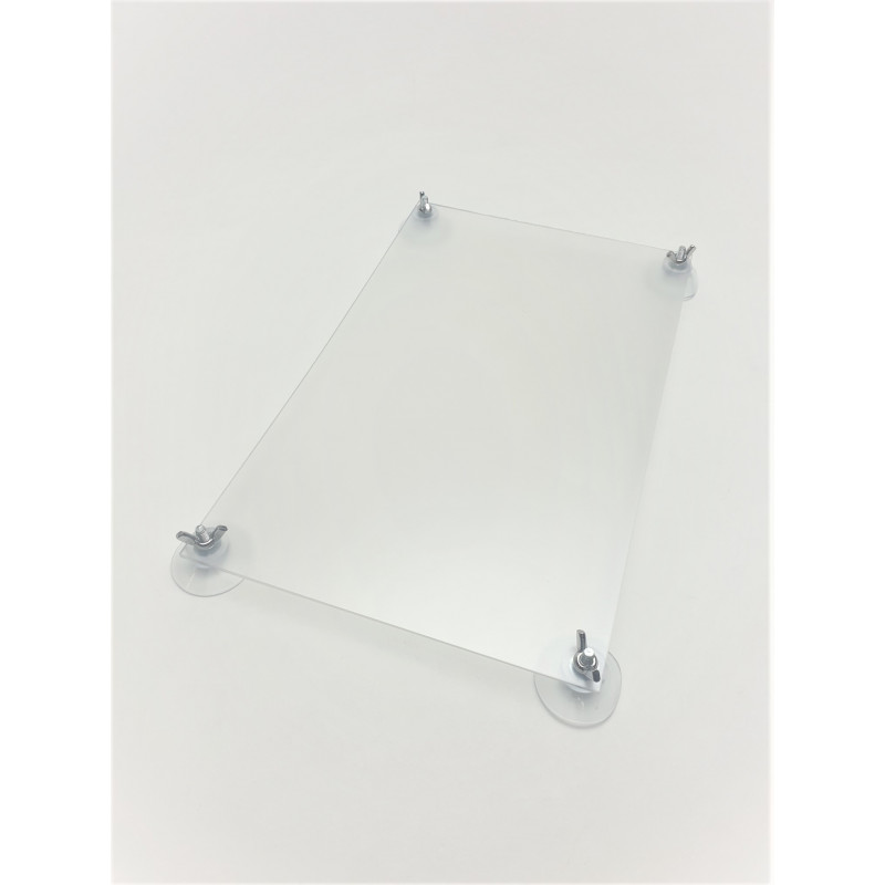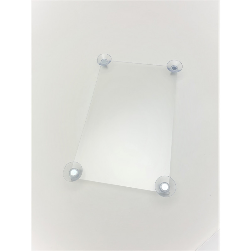 Composé de 2 plaques PET transparent anti-reflet 1mm d'épaisseur + 4 ventouses transparentes. Le PET est une matière transparente, recyclable et compatible avec le contact alimentaire. Livrée non montée. Orientation: Verticale