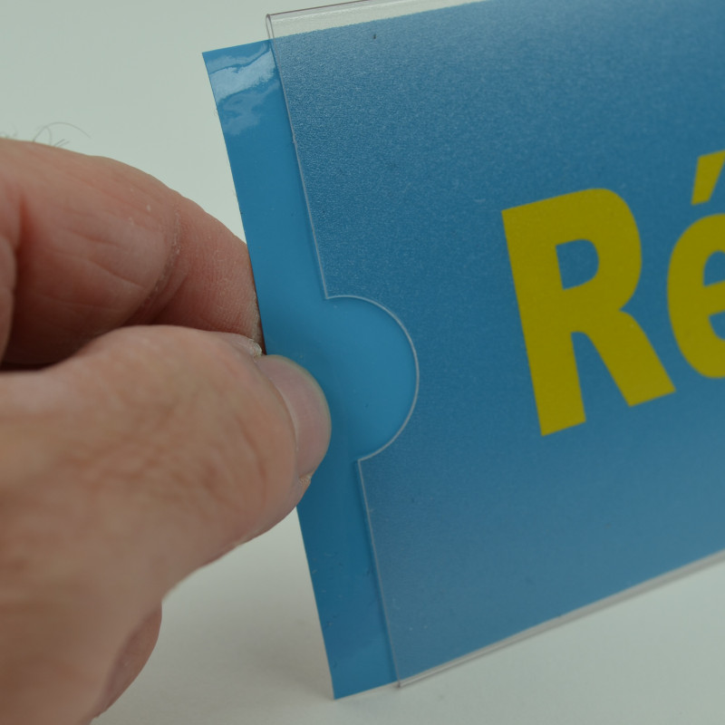 Porte affichette horizontale réalisée en pvc 0.5mm anti reflet muni de 2 bandes de double face transparent. La Pochette porte affiche est disponible en format standard en hauteur 6cm, 8cm ou 10cm et en longueur standard 30cm, 40cm ou 60cm.