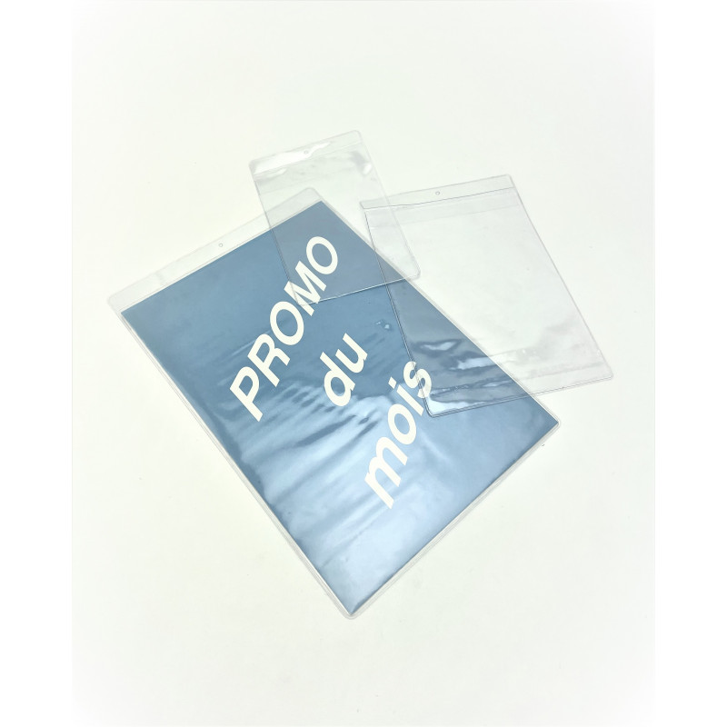 Ce porte affiche à suspendre permet d'afficher vos PLV dans les rayons de magasin. Ce PVC transparent souple perforé et soudé sur 3 côtés permet donc de changer l'affichage via l'ouverture du haut.