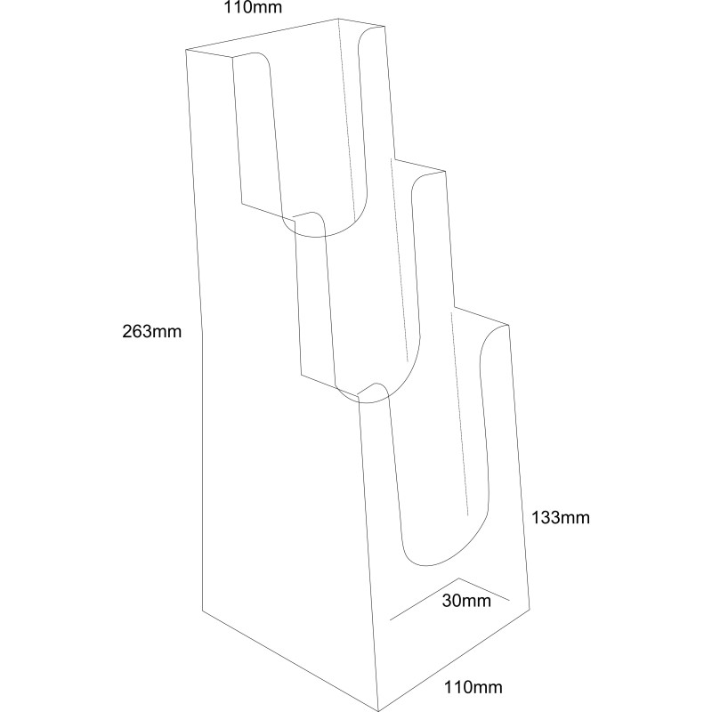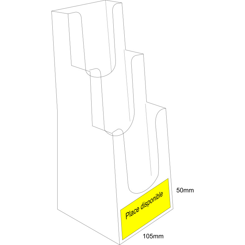 Ce porte brochure injecté transparent est idéal pour mettre en valeur vos publicités, il peut être utilisé en porte leaflet ou porte flyer. Ce présentoir de prospectus et PLV peut s'utiliser de multiples façons en présentoir de comptoir,porte doc pour votre accueil,en distributeur de flyer sur vos salons ou stands ce chevalet injecté est une solution efficace pour présenter vos cartes et PLV sa conception en matière transparente injectée fait de lui un porte flyer pas cher. Ses 3 niveaux de bacs permettent d'avoir un porte brochure présentant plusieurs documentations en un minimum de place.