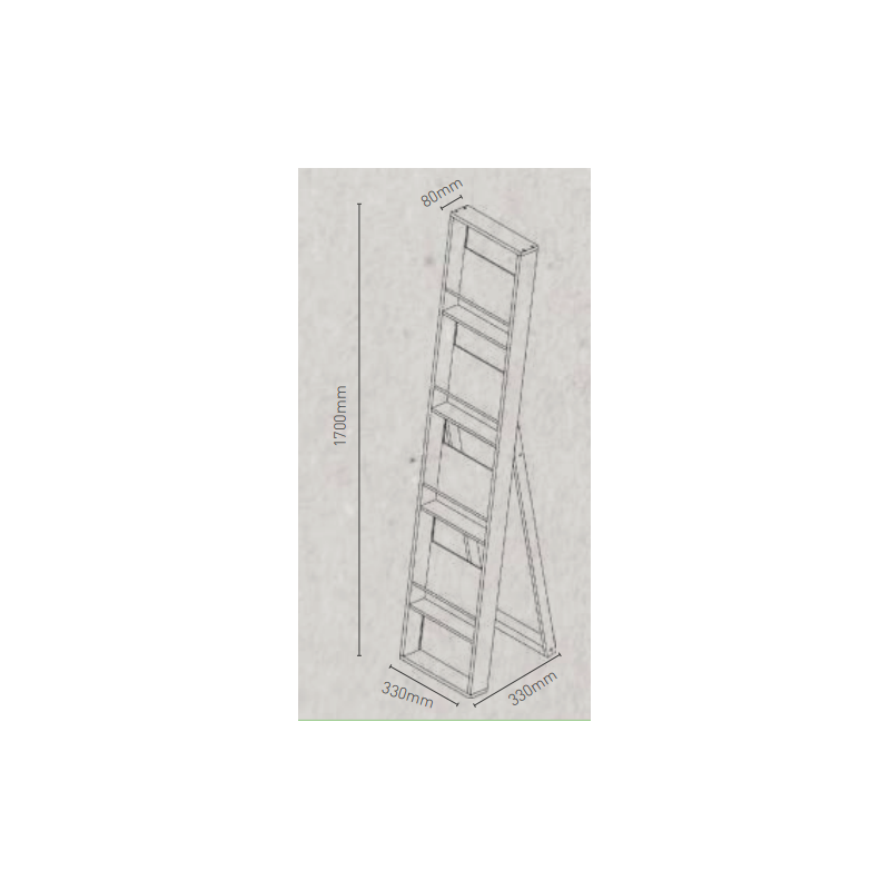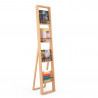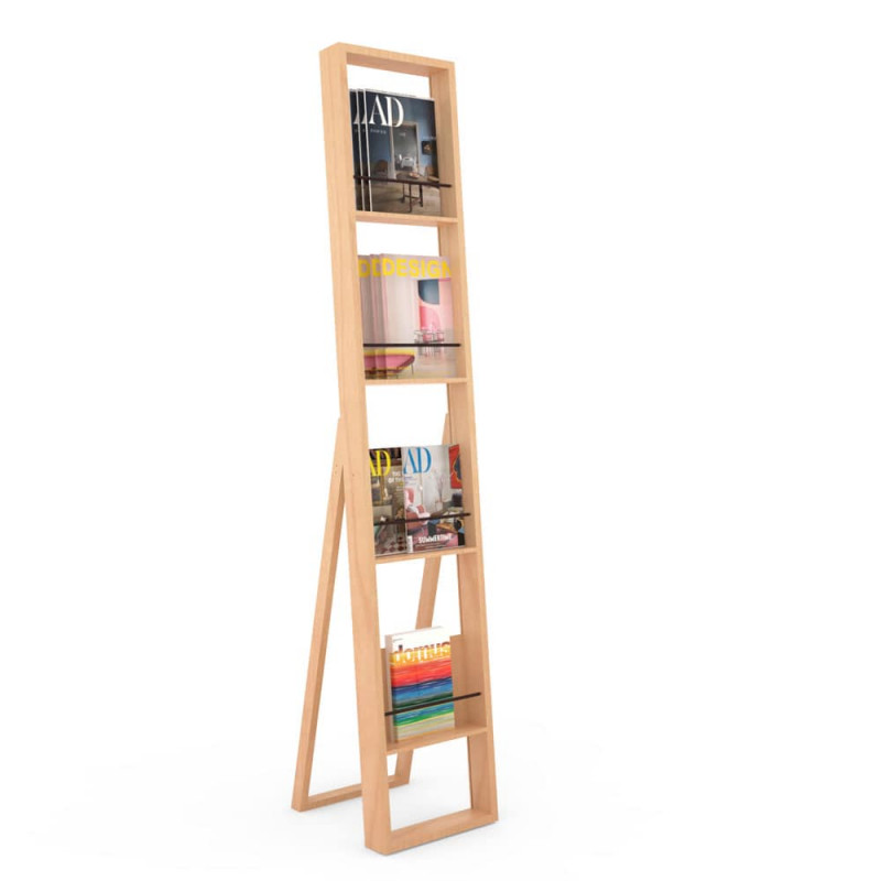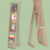 Ce support à brochure de sol se compose d'une structure principale et de 4 étagères fixes avec des lattes en bois de hêtre pour exposer des magazines et des brochures de différentes tailles.