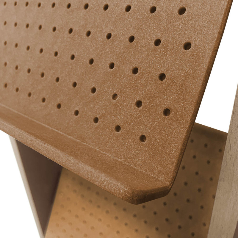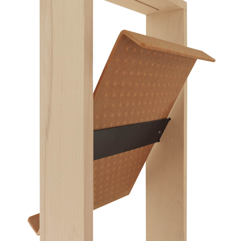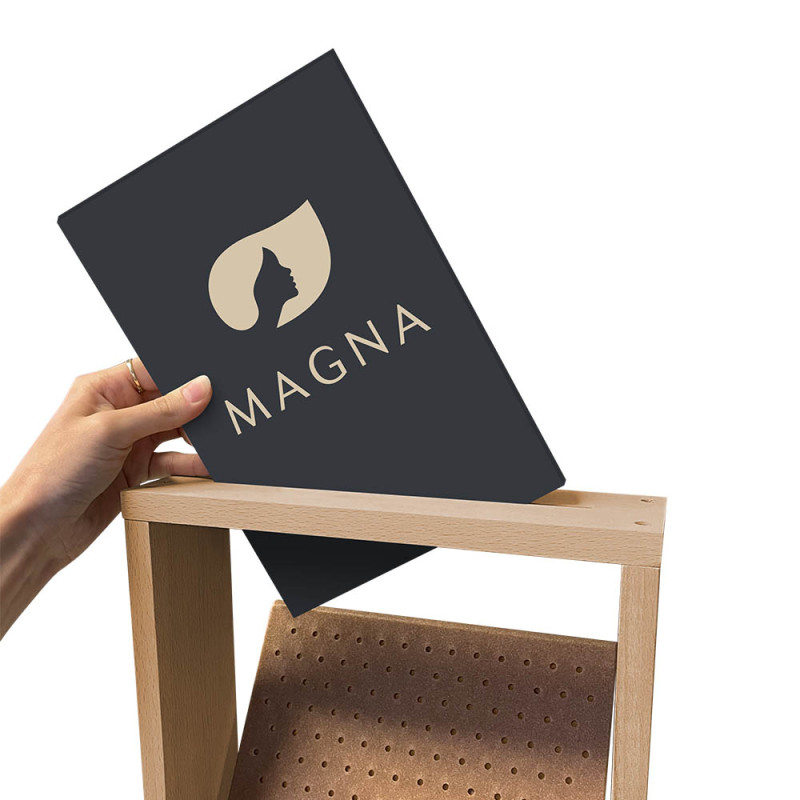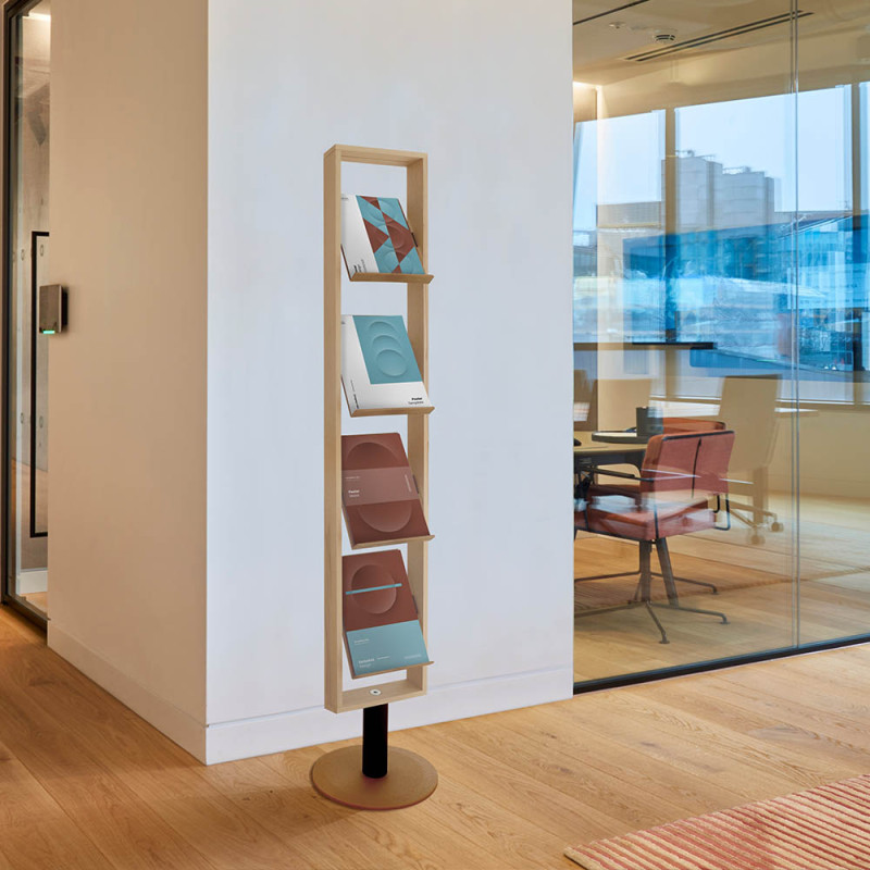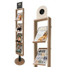 Porte catalogue sur platine ronde fixe, recouverte de résine de bois, ce présentoir moderne et design pourra aussi accueillir une PLV sur le dessus, composé de 4 étagères fixes en résine de bois, légèrement inclinées, vos brochures seront fermement maintenues.