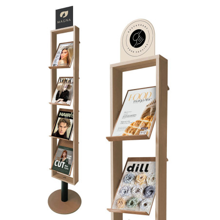 Porte catalogue sur platine ronde fixe, recouverte de résine de bois, ce présentoir moderne et design pourra aussi accueillir une PLV sur le dessus, composé de 4 étagères fixes en résine de bois, légèrement inclinées, vos brochures seront fermement maintenues.