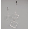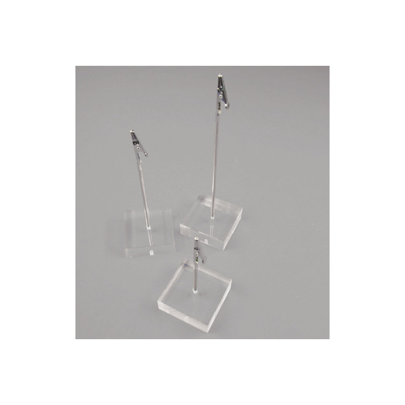 Socle en plexi massif, ép.20mm transparent, poli sur les 4 chants et muni de tige droite en inox, réhaussée d'une pince pour le maintien d'une étiquette.