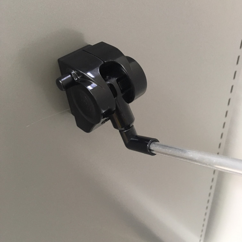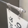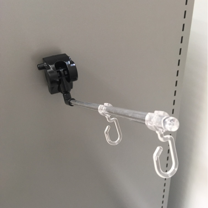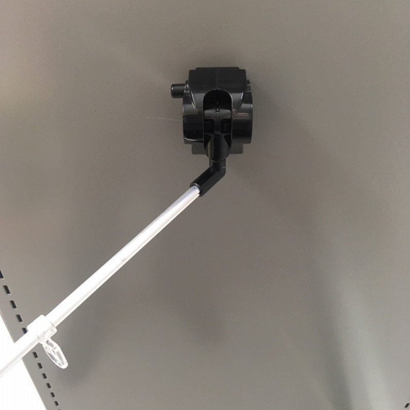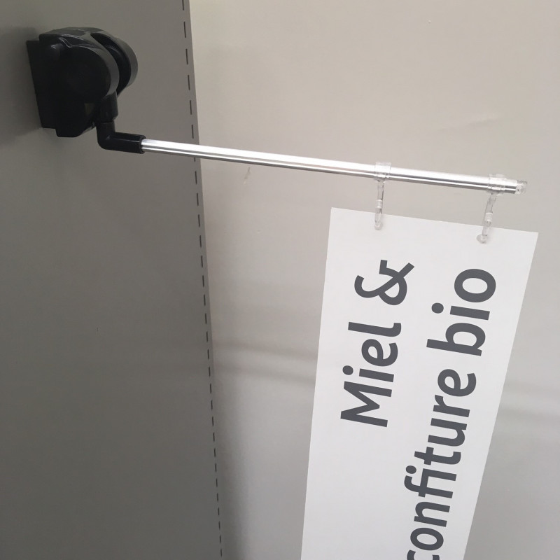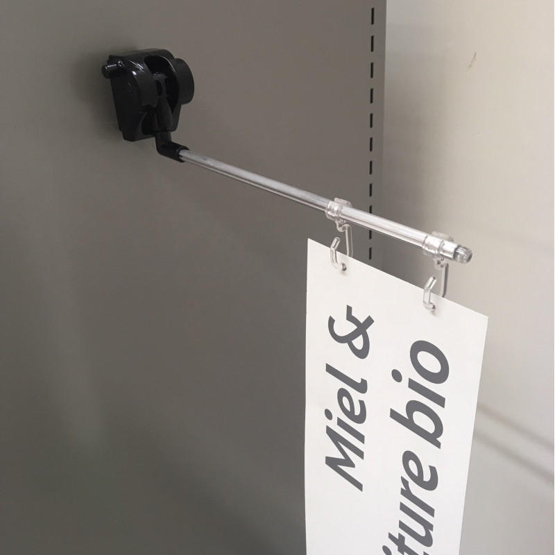Cette potence dispose d'une base magnétique noir (fixation magnétique 50mm x 29mm), d'un bouton poussoir permettant son inclinaison et de 2 crochets déjà monté pour la suspension de votre PLV ou de votre stop rayon.