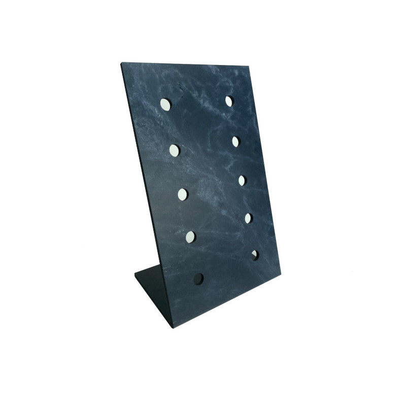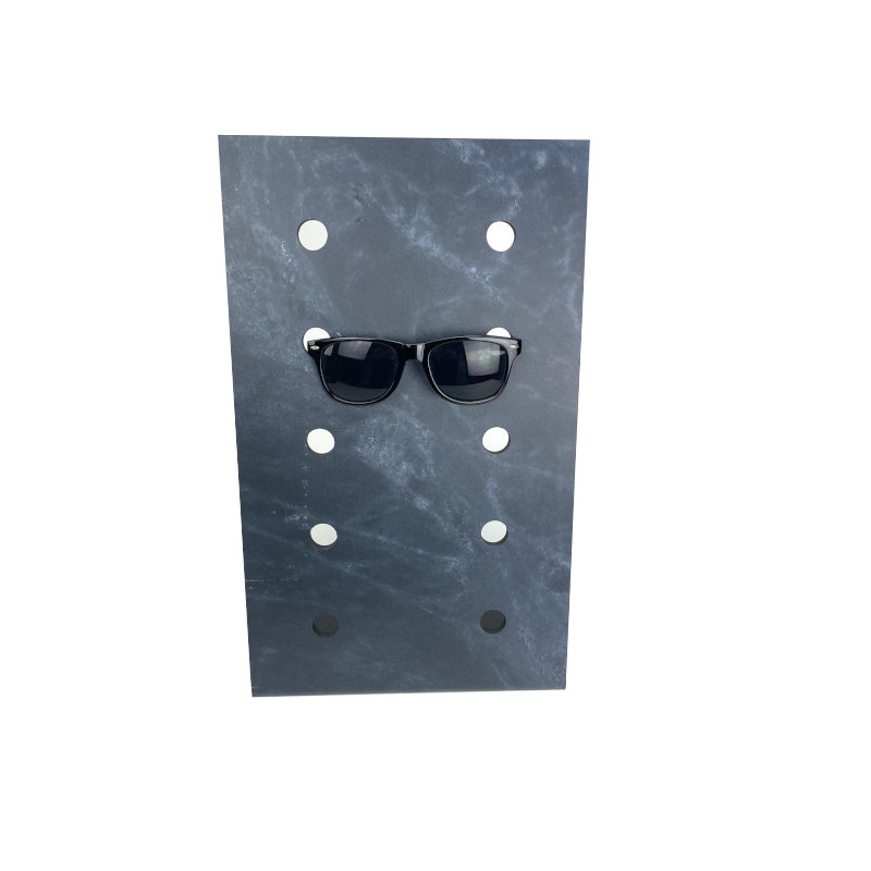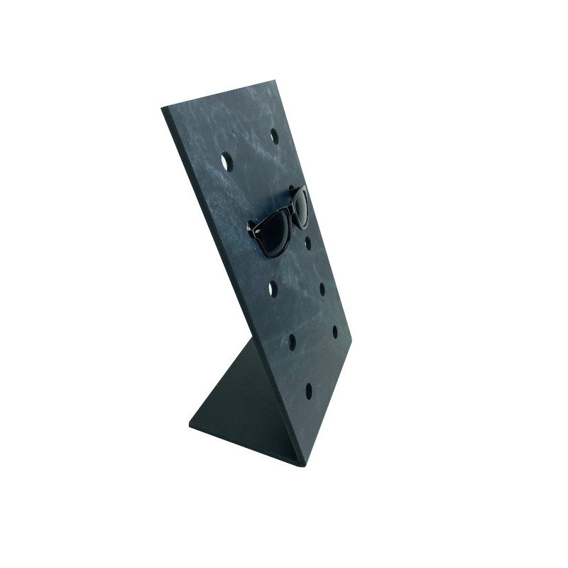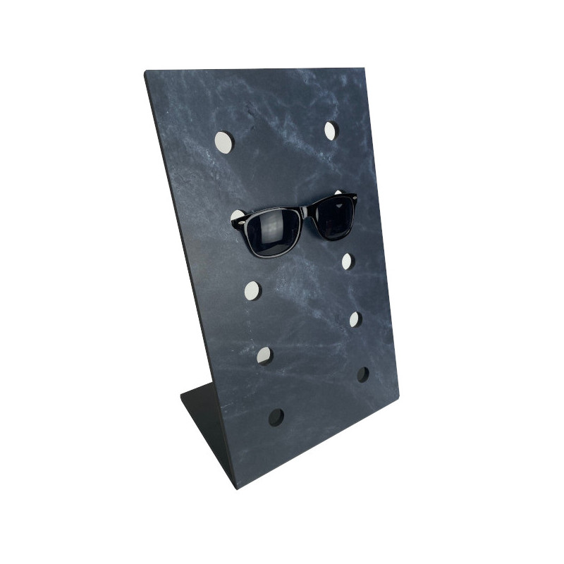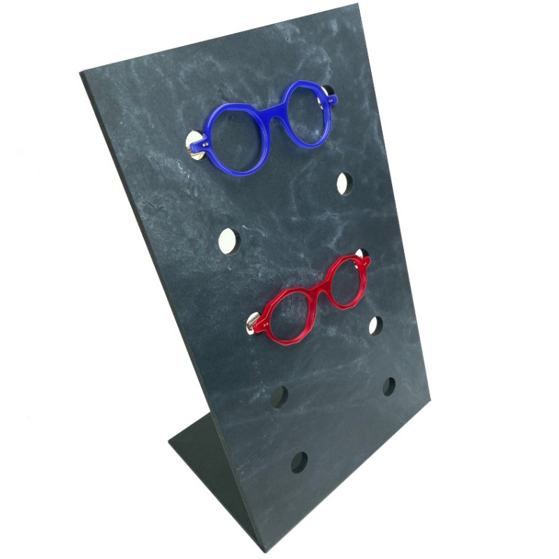 Présentez vos lunettes phares sur une table ou comptoir grâce à ce chevalet présentoir en PVC noir. Fabriqué en PVC expansé 8mm noir, avec une impression effet marbré sur la face avant.