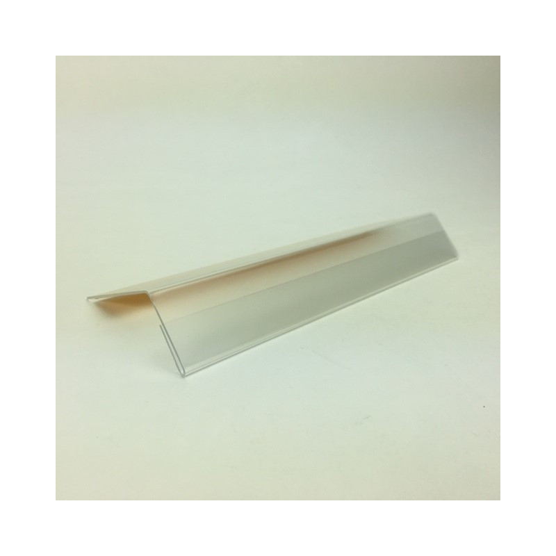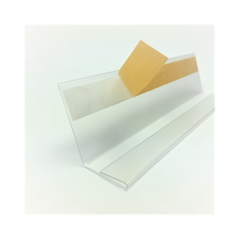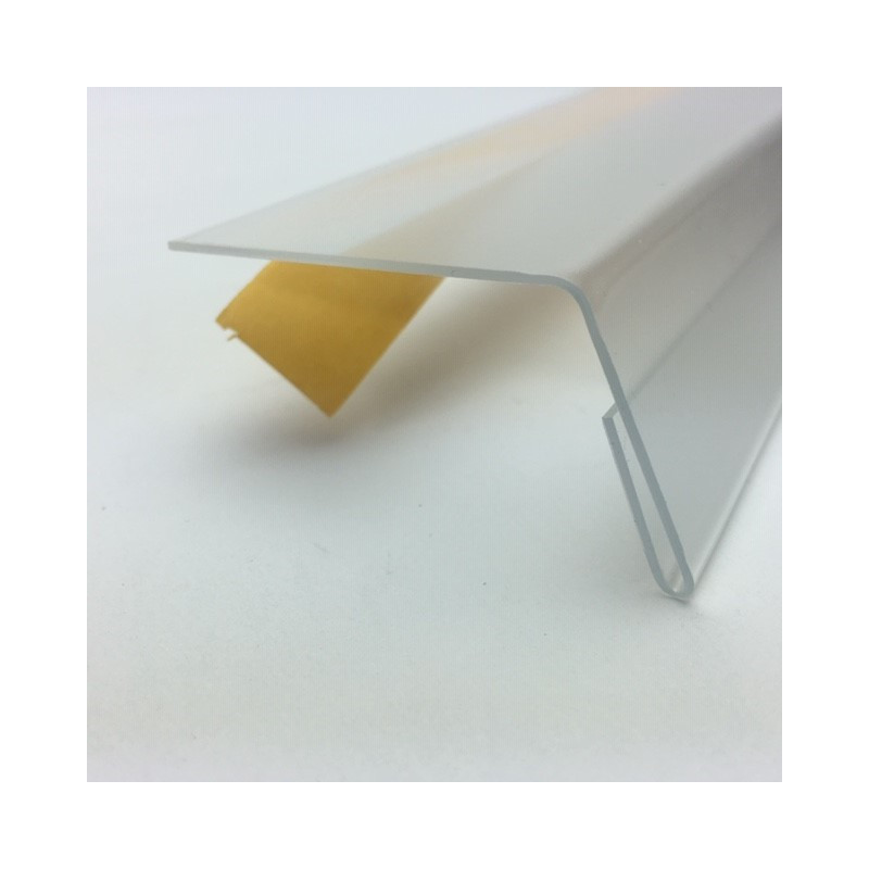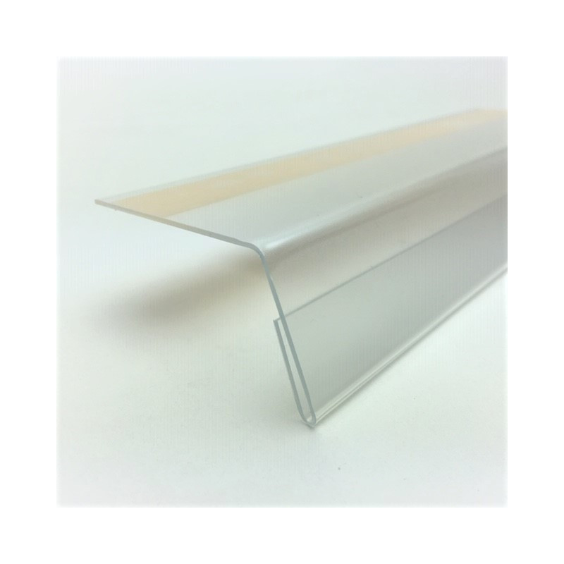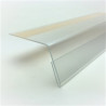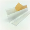 Ce support étiquette dispose d'un retour de 5cm qui permet sa fixation sur gondole ou tablette à l'aide de l'adhésif blanc fixé sous le support.