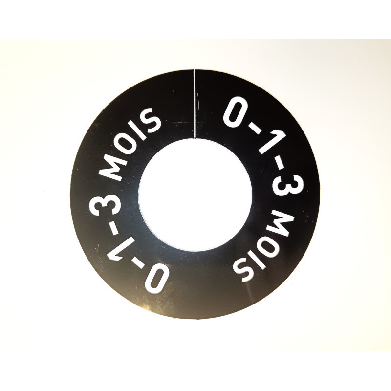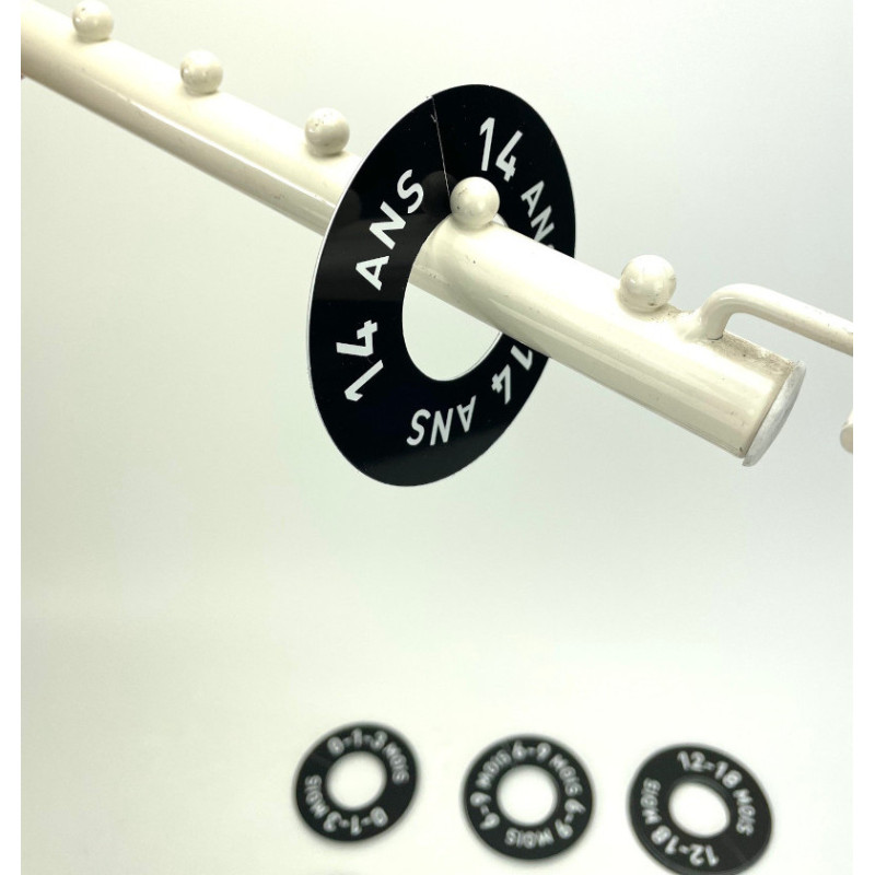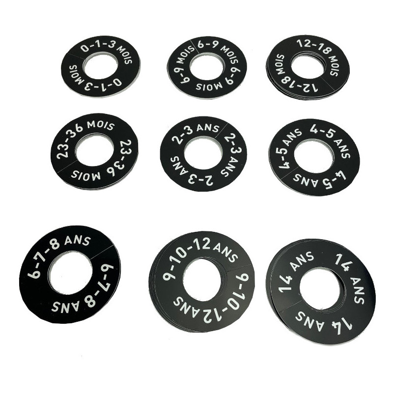 Grâce à ces séparateurs de taille pour vêtement, vous et vos clients auront une meilleure vision sur l'ensemble des tailles proposées dans votre rayon vêtement. Séparateur de taille d'un diamètre de Ø 90mm. Il est équipé d'une découpe facilitant l'insertion sur la barre en l'écartant.