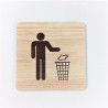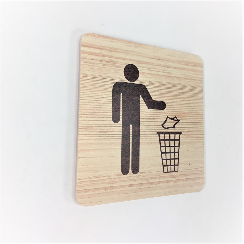 Plaque de porte pour signalétique de poubelle. Cette plaque est réalisée en PET 4mm transparent, matière recyclable, avec impression numérique type bois.
