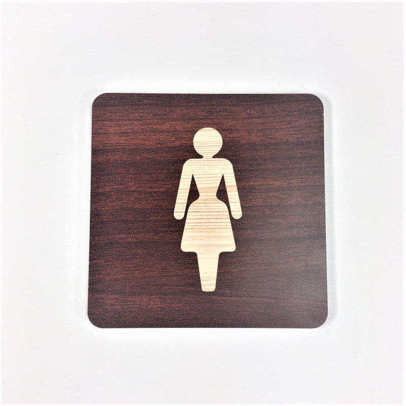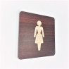 Plaque signalétique de porte réalisée en PET 4mm transparent + impression numérique type bois + logo toilettes femme.