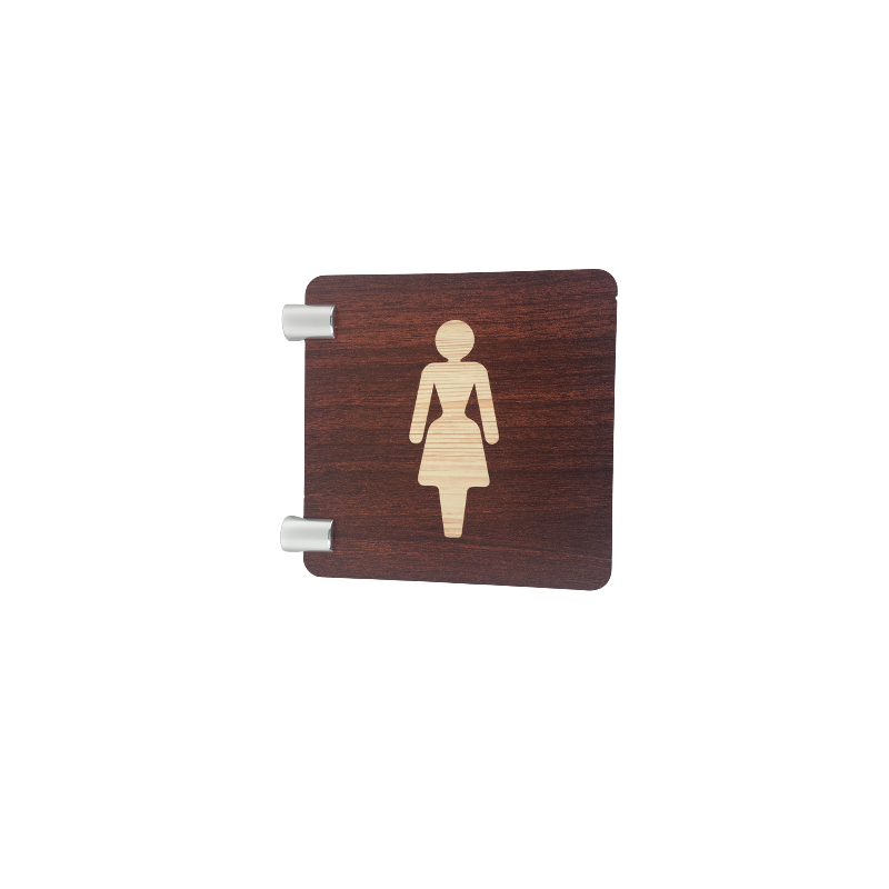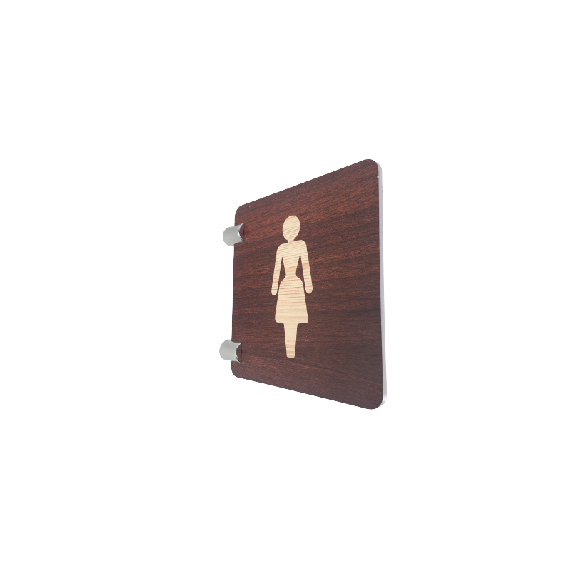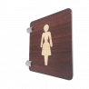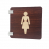 Cette plaque de signalétique est réalisée en PET 4mm transparent (recyclable), elle est imprimée recto verso d'un fond bois et d'un pictogramme "toilettes femme".