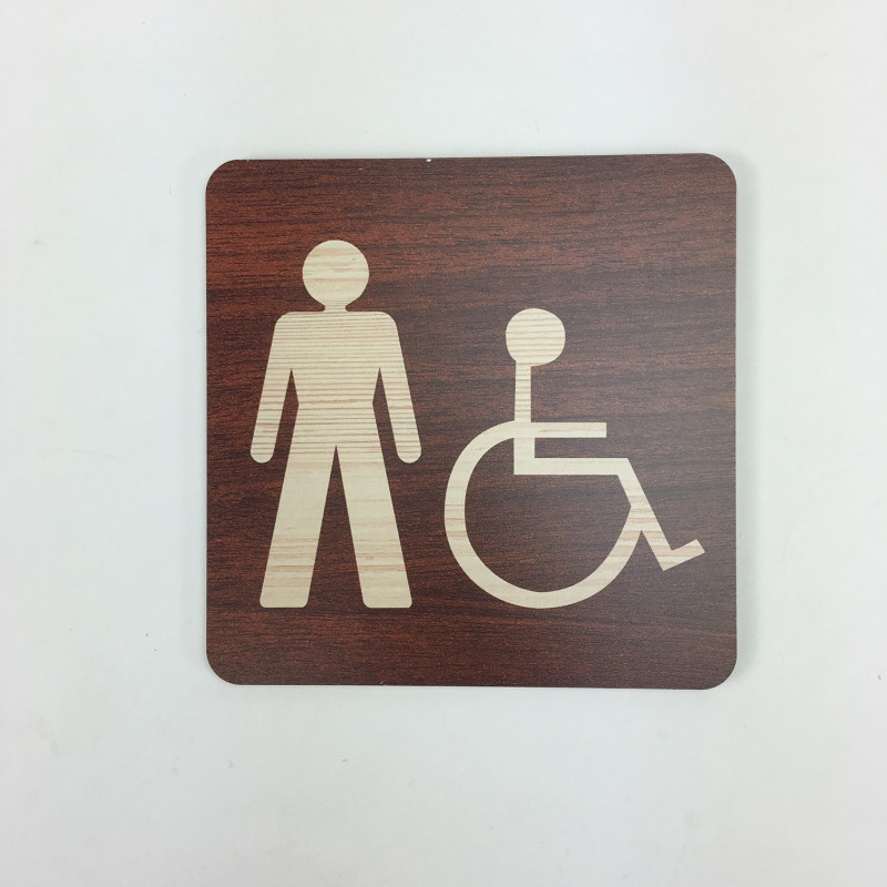 Fixation de la plaque de signalisation de toilettes pour homme par double face (fourni posé) réalisée en pet 4mm transparent (recyclable) avec impression numérique type bois.