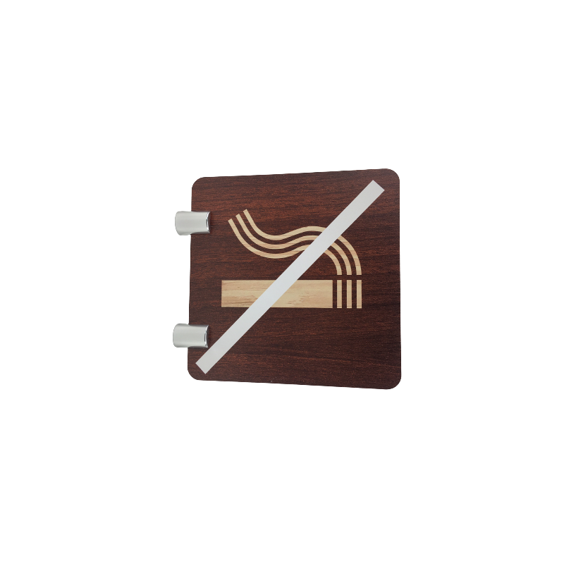Cette plaque de signalétique est réalisée en PET 4mm transparent (recyclable), elle est imprimée recto verso d'un fond bois et d'un pictogramme "interdit de fumer"