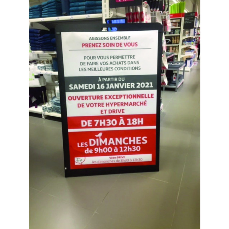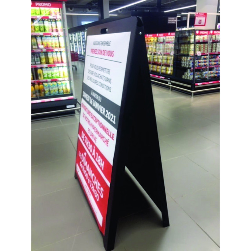 Chevalet publicitaire tréteau porte affiche grand format. Vous pouvez ainsi exposer vos grands visuels, de format A0 (120 x 80cm) notamment. Possibilité d'imprimer directement votre visuel sur devis.