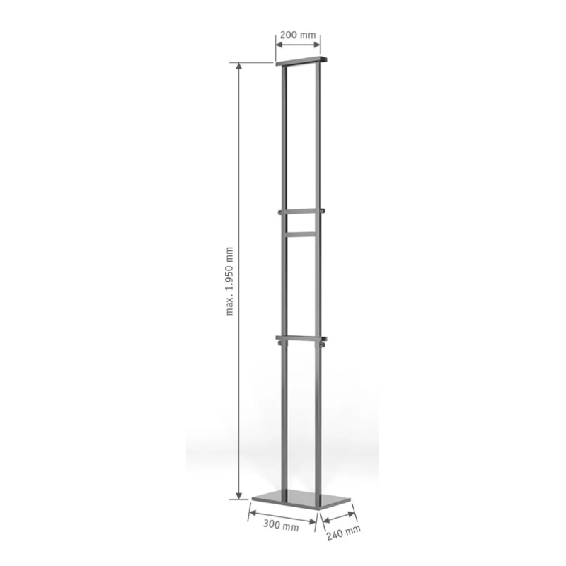 Fabriqué en acier noir, il s'intégrera facilement à divers environnements. Ce support est télescopique de 1100 à 1950mm. Il offre donc de nombreuses possibilités d'utilisation, et une grande flexibilité en largeur.