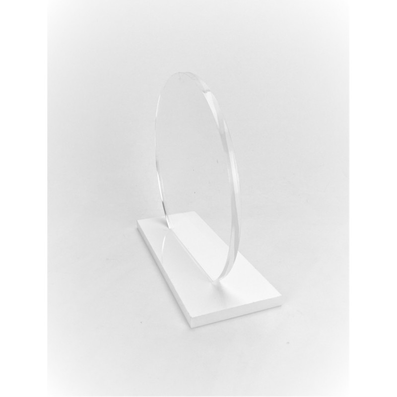 Découpe rond Ø 190mm en plexi 8mm sur un socle 190 x 80mm en plexi blanc 10mm, le tout collé.