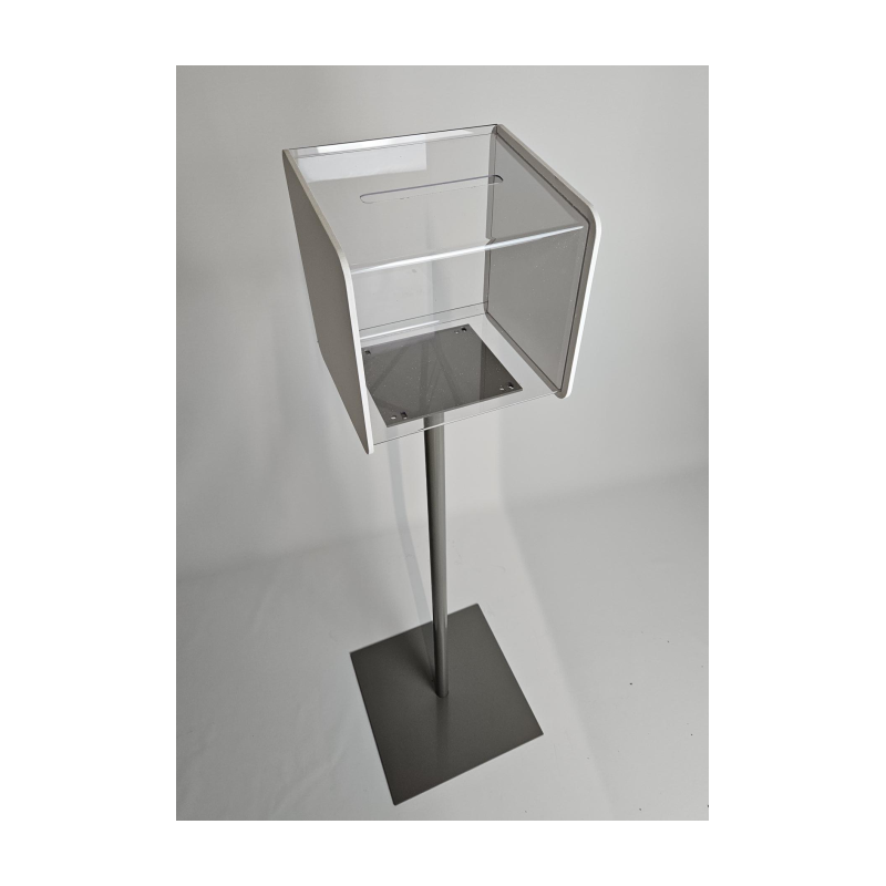 Cette urne de vote avec son pied peut être utilisée directement posée au sol, transparente avec 2 joues blanches sur les cotés elle est idéale pour vos animations commerciales, jeux concours, tombola, questionnaire clients, élections.