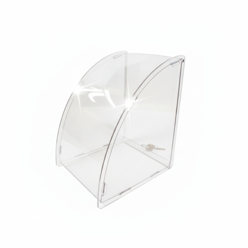 Vitrine présentoir à produit réalisée en PET transparent, sa forme ovale et design est idéale pour la mise en avant de produits.